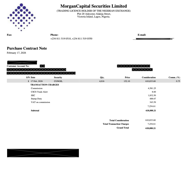 Here is a real contract note from a Nigerian broker (with personal details redacted), annotated to show each section:
