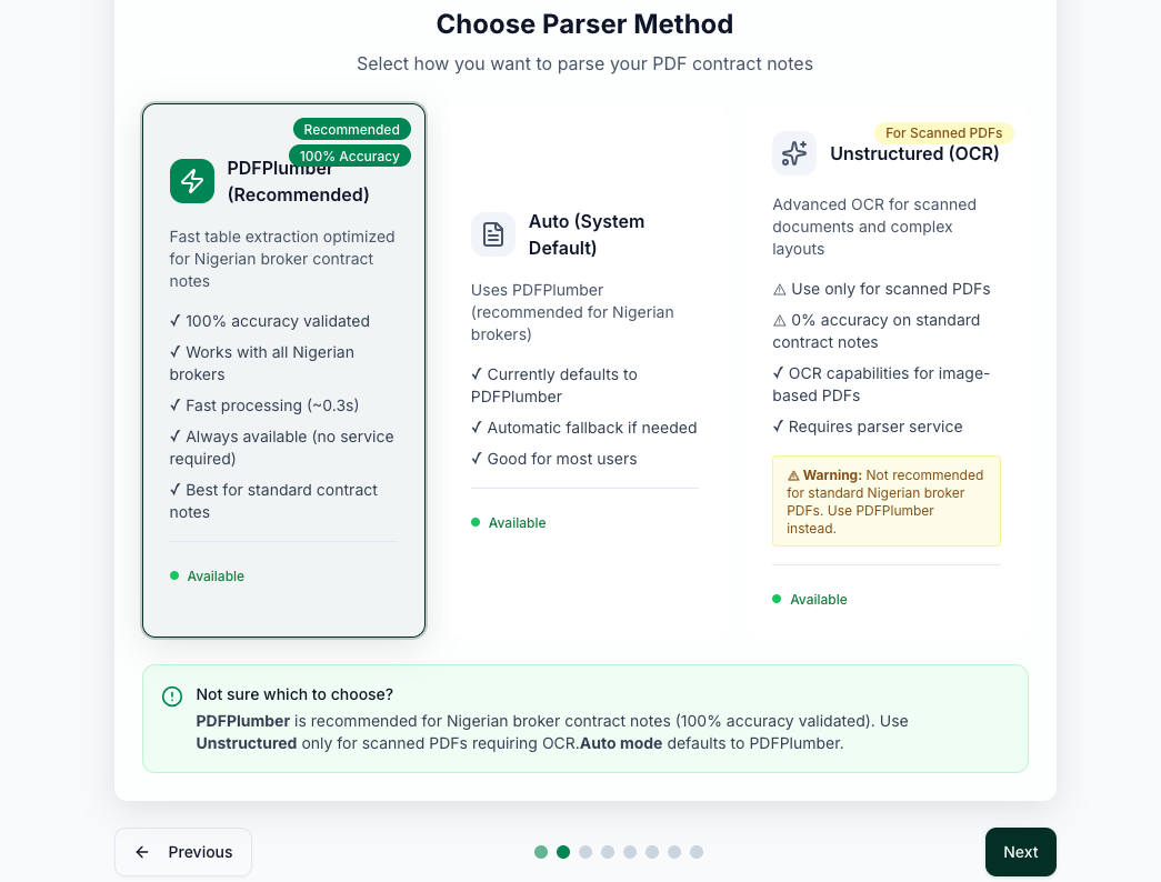 PDFPlumber (Recommended) — Highlighted with a "Recommended" and "100% Accuracy" badge. This is our primary parser, optimised for Nigerian broker contract notes. It is fast (~0.3 seconds), works with all Nigerian brokers, is always available with no external service required, and is the best choice for standard contract notes.